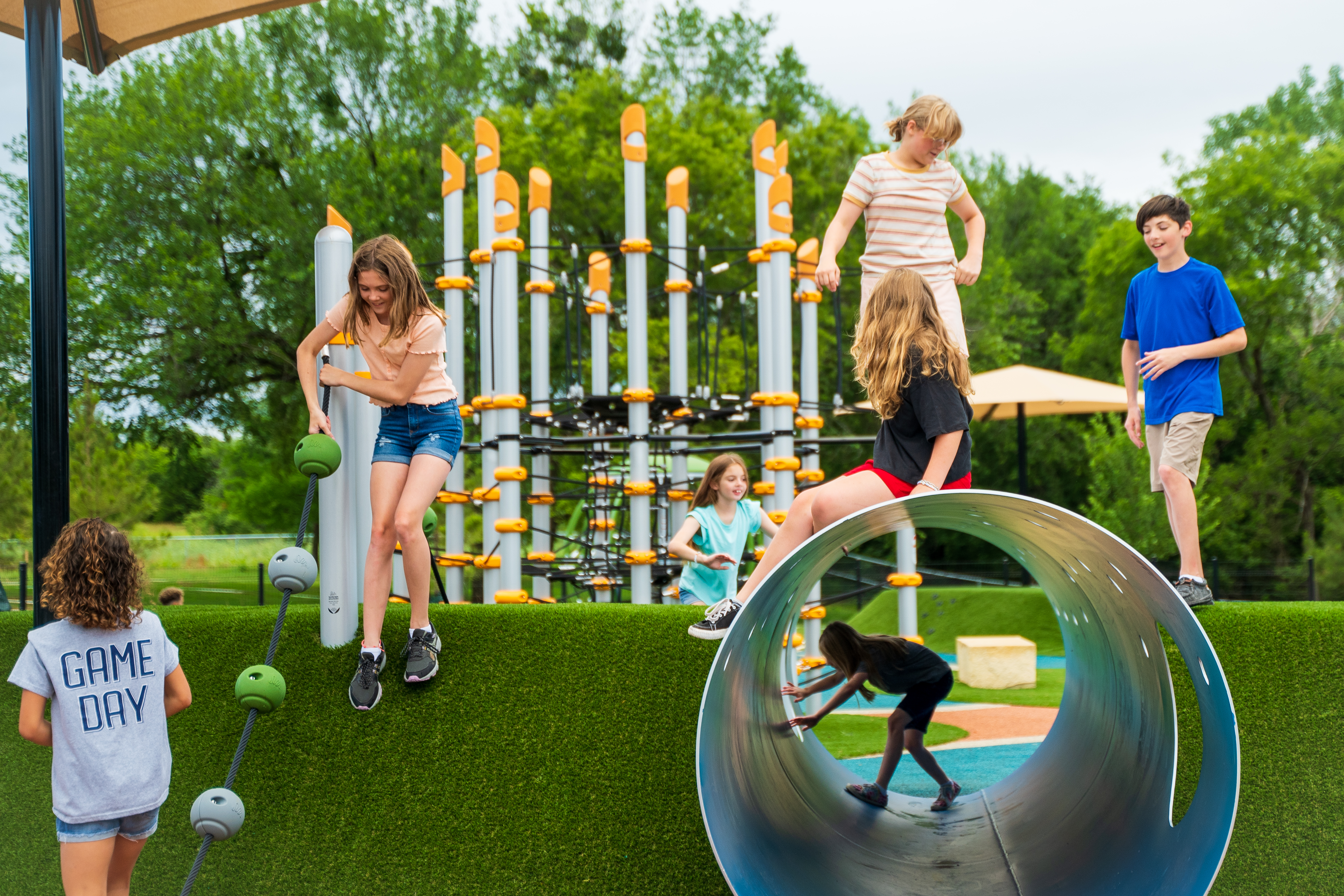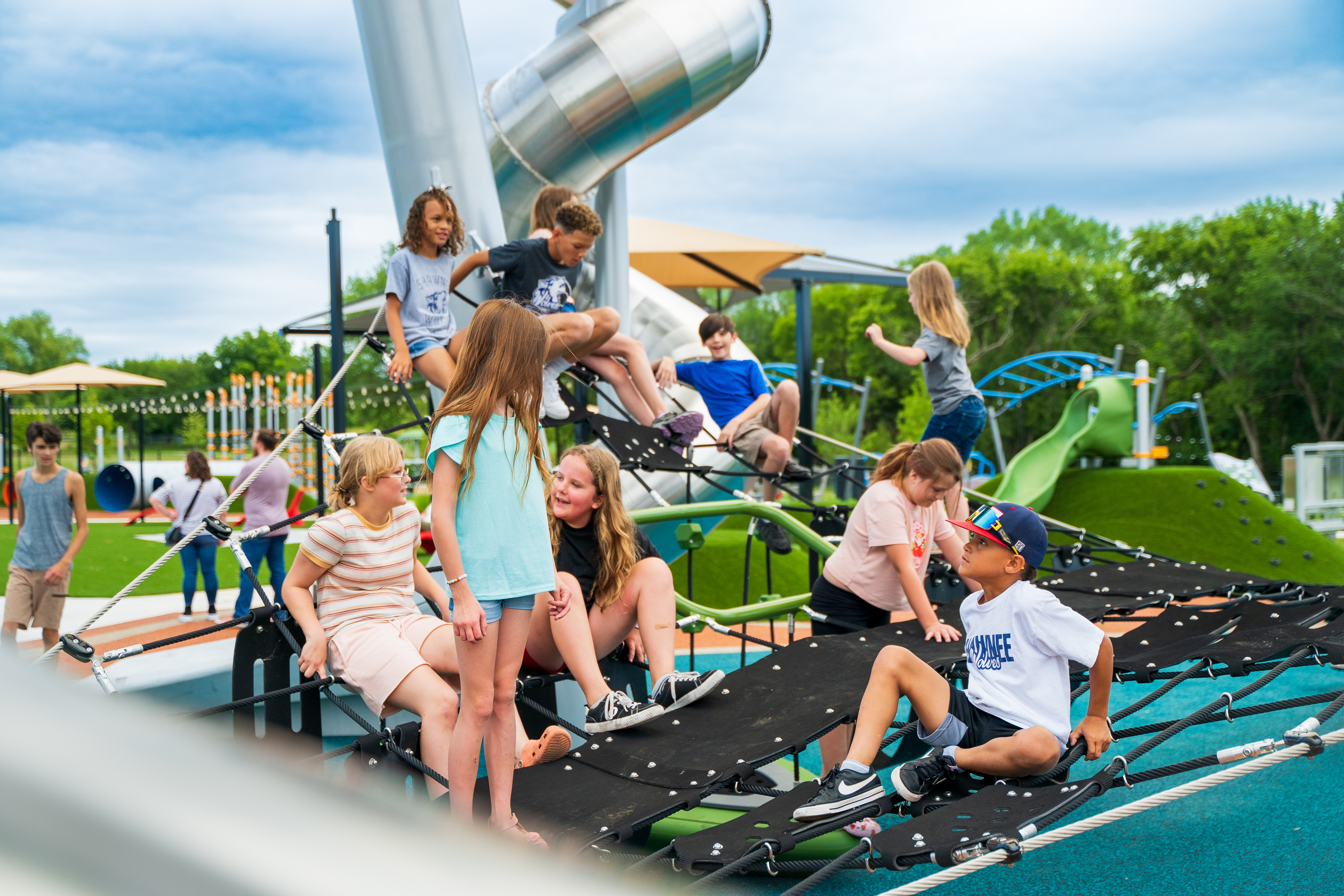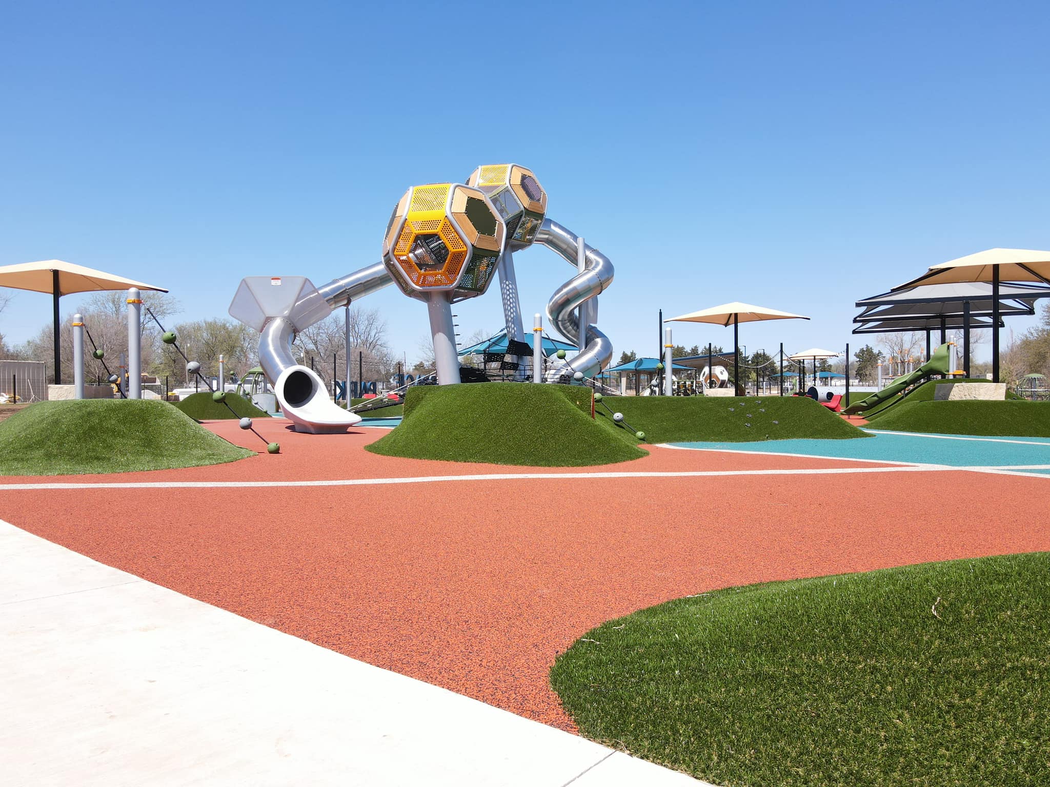The new KidSpace Park is now open! One of Oklahoma's top 5 largest premier parks, this playground for all ages includes playgrounds for kids from 2 - 100, including a walking trail, timed 40 meter dash and ninja course, with play structures for littles, middles, and big kids.