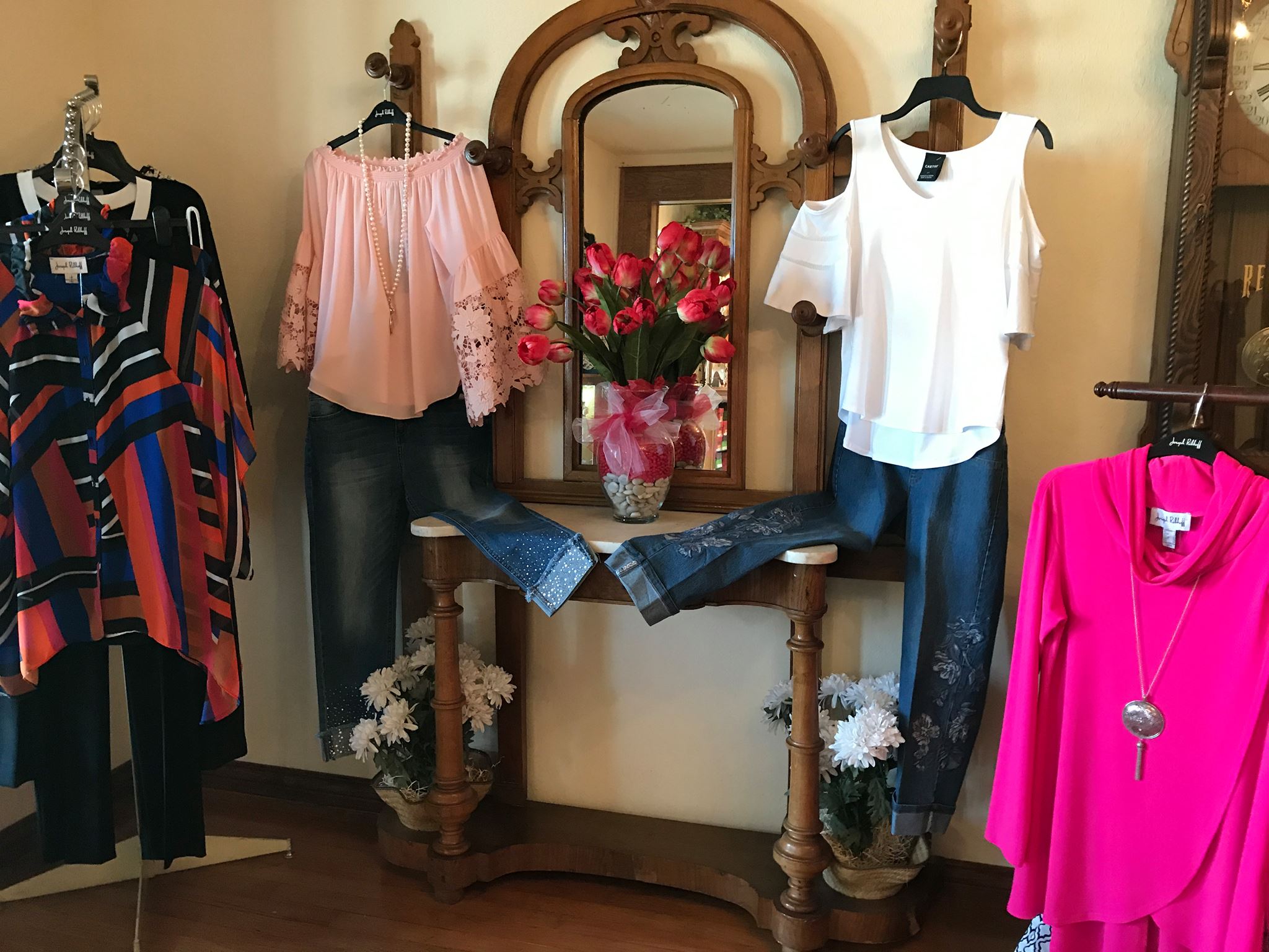 The store carries many wonderful lines of clothing for women in sizes 2-16 and XS -XL. Fashions from such lines as Joseph Ribkoff, Frank Lyman, City Girl, Multiples, Lisette L, Lynn Ritchie, and Damee. Brighton handbags, accessories, and gifts along with Brighton footwear are always available. Vaneli and Yellow Box complete the footwear department.