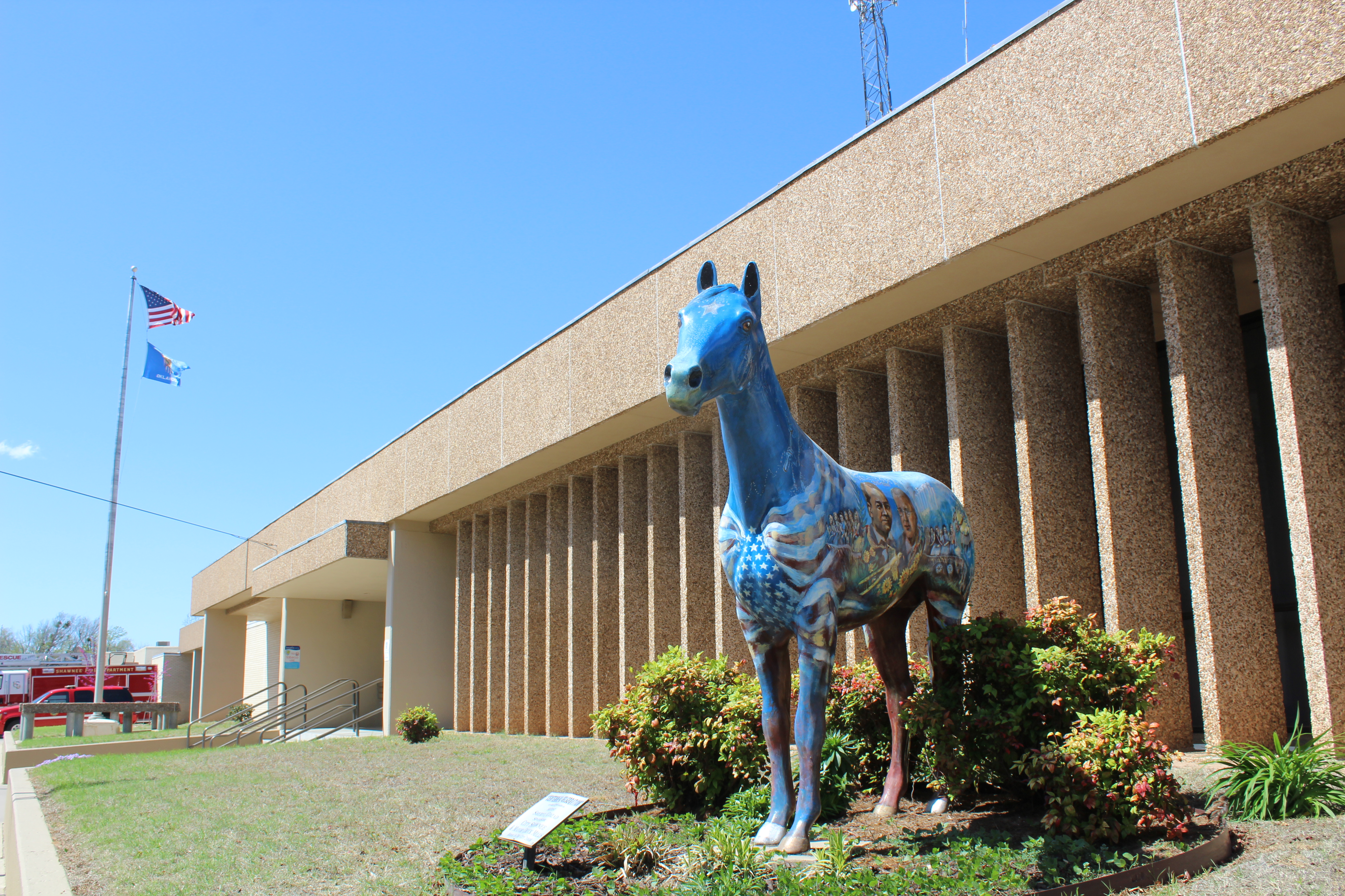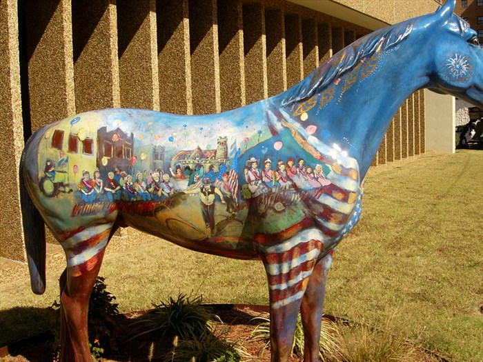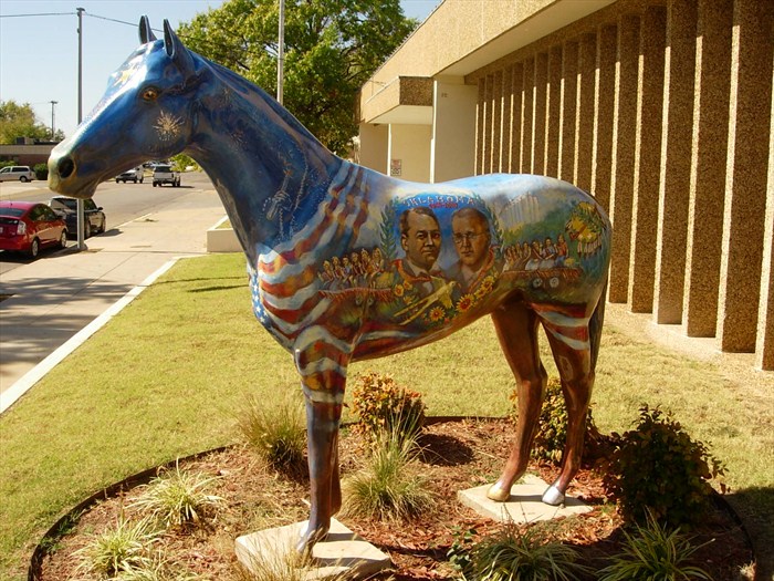 This horse was commissioned by the City of Shawnee. One side of the horse depicts two governors: Gov. Charles Haskell from 1907 and Gov. Brad Henry from 2007. On that side, a statehood celebration is depicted with many figures in early 20th clothing. In addition, the historical train station is shown. On the horse's other side, a centennial celebration parade is shown complete with approximately 27 portraits of Shawnee citizens riding on floats or riding cars or tractors in the balloon-filled parade. Feathers and flags are included in the depiction. This horse has been in front of the Shawnee City Hall.