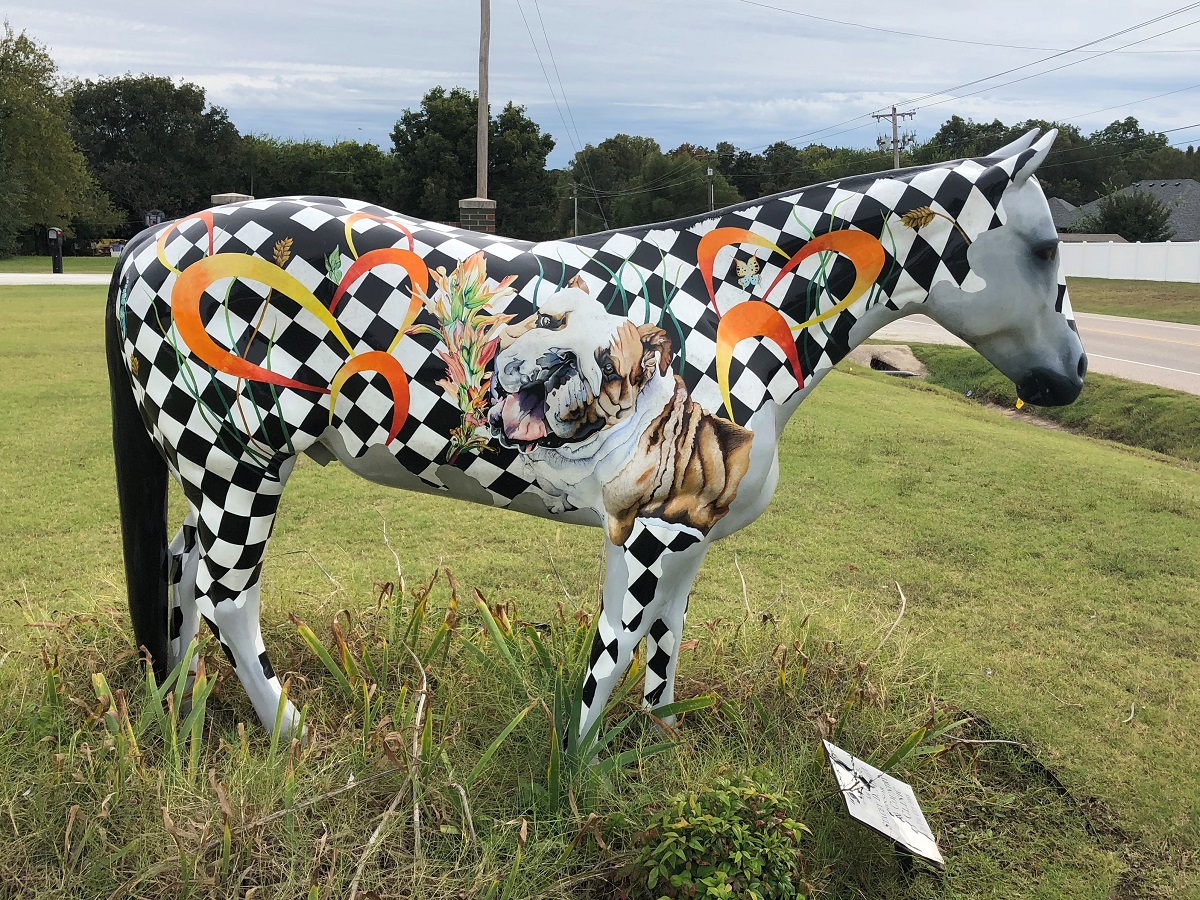 Artist Stacey D. Miller collaborated with a veterinarian to create the design of this horse. At this time, the veterinarian raised and showed English Bulldogs. Because it was his favorite, he incorporated English bulldogs on this horse. The other characteristics of the horse are flowers, butterflies, wheat, and grass. Each element is representing the state Oklahoma and the sister city in Japan.